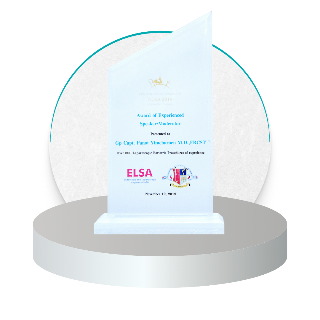 In 2019, Dr. Panot Yimcharoen received an award from the Endoscopic and Laparoscopic Surgeons of Asia (ELSA) for his experience in performing over 300 endoscopic and bariatric surgeries.