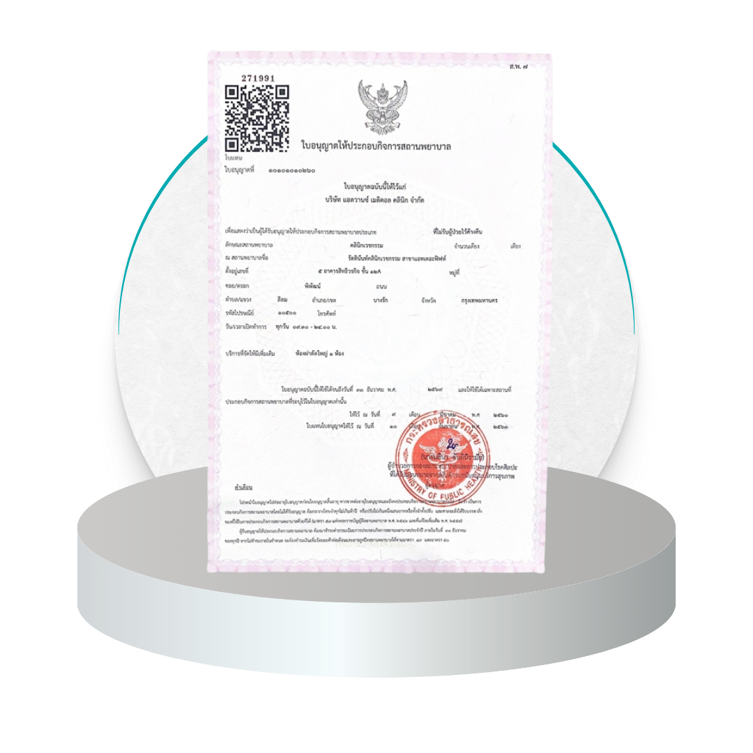 Rattinan Clinic is a legally licensed medical facility, holding an official license from the Ministry of Public Health, certifying its compliance with safety standards in medical and aesthetic surgery services.