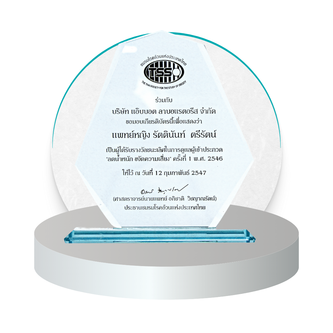 In 2003, Dr. Rattinan Treeratana was awarded First Prize in Patient Care for the National Weight Loss Contest by the Obesity Association of Thailand.