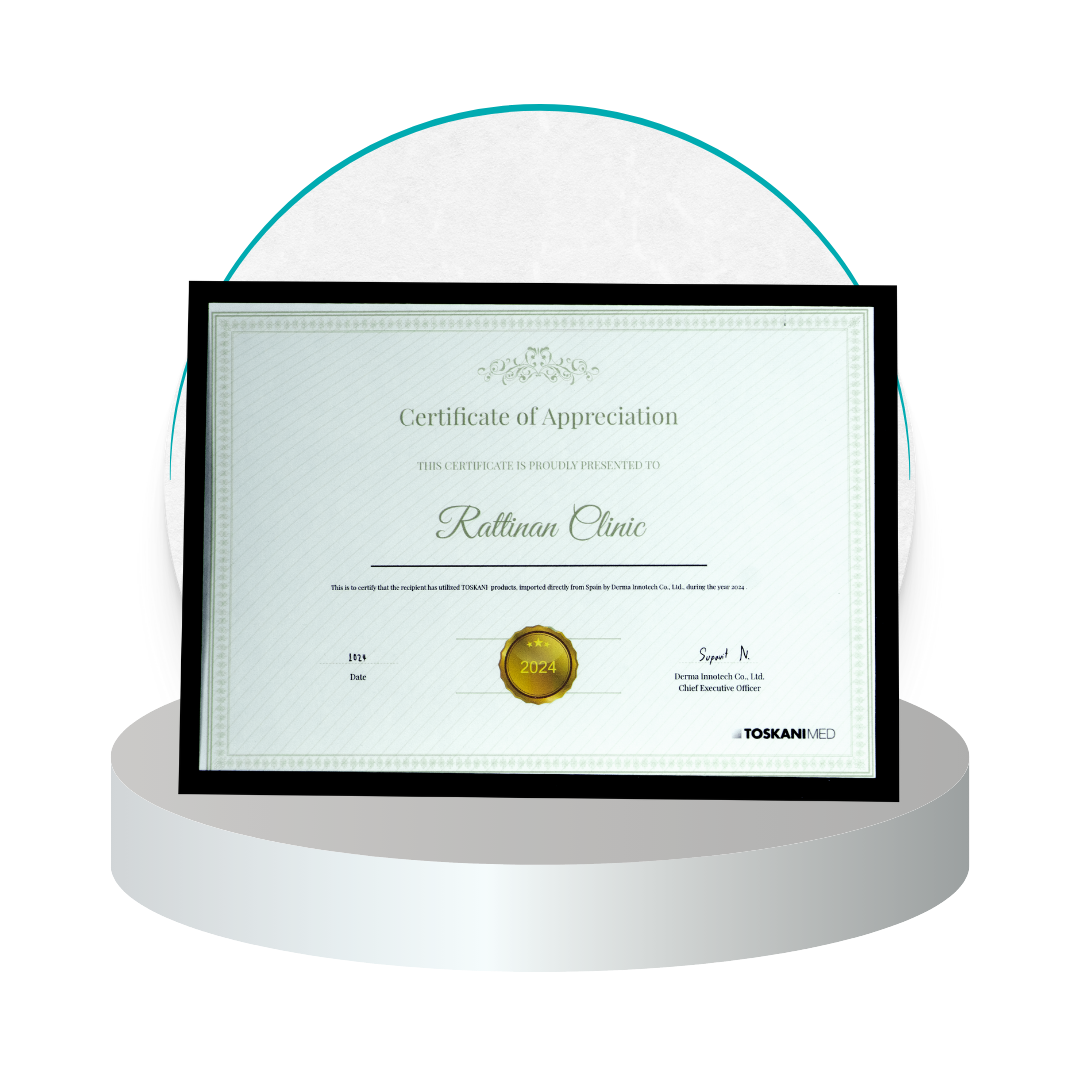 In 2024, Rattinan Clinic received recognition from TOSKANI (Spain) in appreciation of its continued trust and use of TOSKANI products.