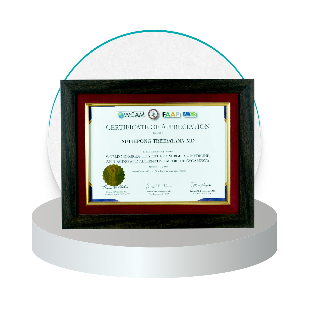 Dr. Suthipong Treeratana received a Certificate of Appreciation as an invited speaker at the World Congress of Aesthetic Surgery – Medicine, Anti-Aging and Alternative Medicine (WCAM 2022).