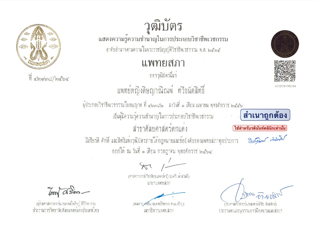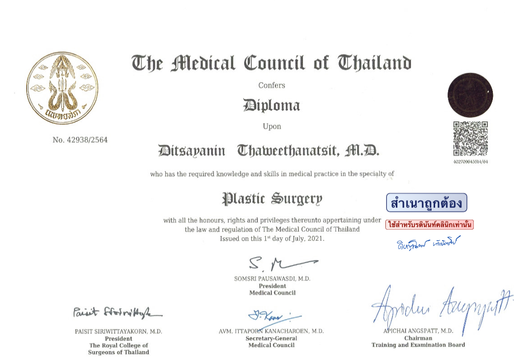 Dr. Ditsayanin Thaweethantsit is a highly accomplished and dedicated plastic surgeon with expertise in a comprehensive range of aesthetic and reconstructive procedures. Dr. Ditsayanin is committed to delivering personalized care and utilizing advanced surgical techniques to help patients achieve their desired aesthetic goals while prioritizing natural-looking and harmonious results.