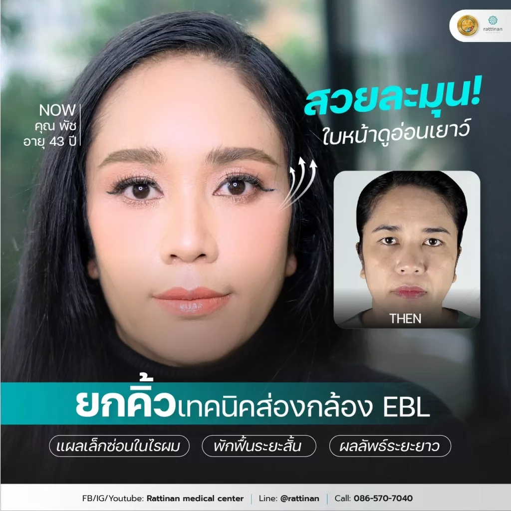 ยกคิ้วส่องกล้อง (EBL) คือการยกคิ้วและหน้าผากด้วยเทคนิคส่องกล้องผ่านแผลเล็ก ช่วยลดริ้วรอย แก้หนังตาตก โดยไม่ต้องผ่าตัดใหญ่ เหมาะกับคนที่อยากดูหน้าอ่อนเยาว์อย่างเป็นธรรมชาติ ปรึกษาแพทย์ฟรี ที่ รัตตินันท์ คลินิก