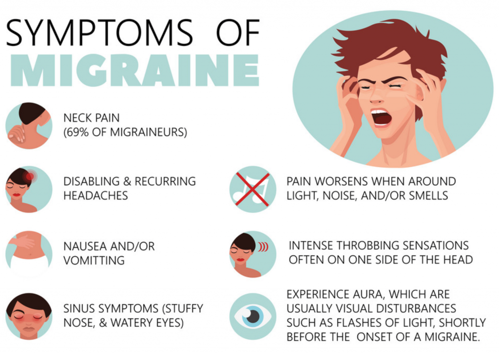 อาการของไมเกรน คือ ปวดศีรษะเพียงข้างใดข้างหนึ่ง ซึ่งอาจจะปวดศีรษะสลับซ้ายขวา บ้างในบางครั้งหรือในแต่ละรอบ โดยอาการปวดศีรษะที่พบมักจะมีอาการปวดตื้อๆ ปวดตุ๊บๆ มึน งง มีอาการตาพร่ามัว อาการคลื่นไส้ อาเจียน บางรายจะมีอาการเห็นแสงจ้านำมาก่อน หรือมีอาการแขนขาอ่อนแรงข้างในข้างหนึ่งข้างใดก็ได้ และค่อยมีอาการปวดศีรษะตามมา